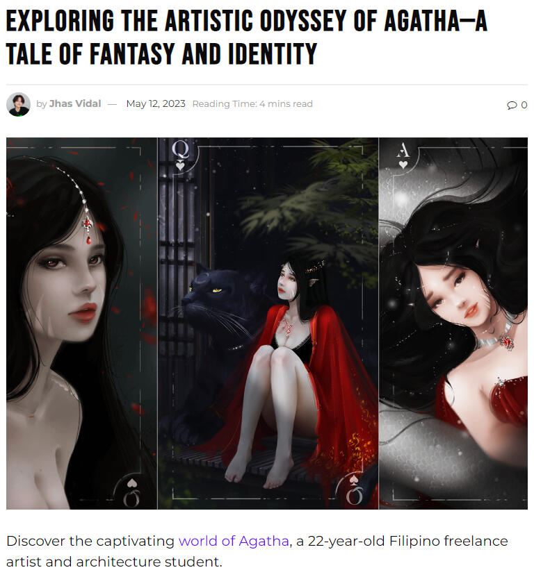 I’m Ellysa Bucasas "Agatha" , a freelance artist and an architecture student from the Philippines. My artworks have graced creative exhibits such as ArtFair Philippines 2023 and CONQuest Festival 2022. The pieces I created also received the honor of traveling to various corners of the globe, including Italy and Vietnam.As a growing artist, I've been meaning to realize the prospect of fusing both disciplines of 2D illustration and 3D architectural models to constantly enhance my craft.